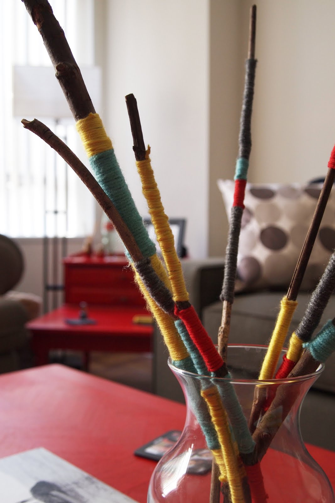 These are Twiggies. Jamie found the idea online, so we bought some yarn, found some sticks, and now we have an awesome centerpiece for our coffee table.